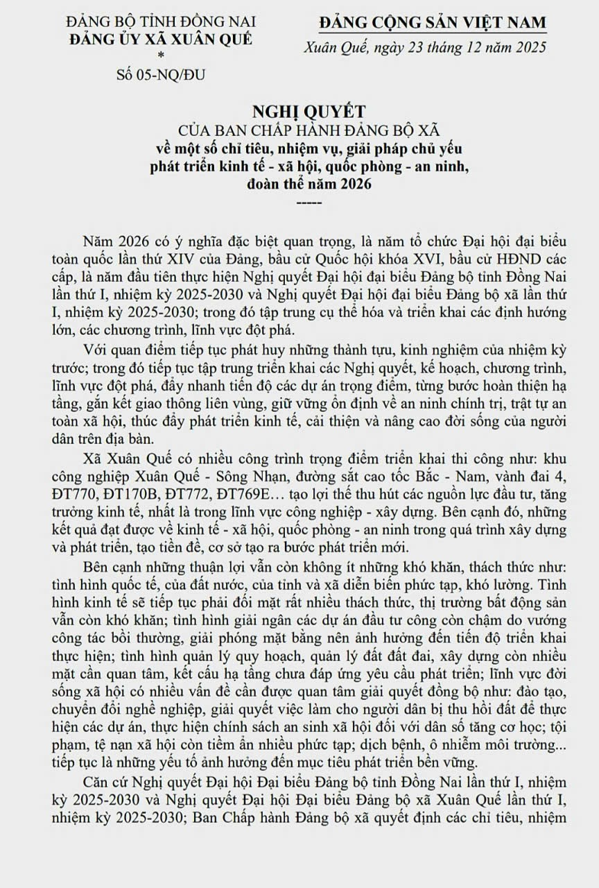 <div style="text-align: center;"><span style="font-size:11pt"><span style="line-height:normal"><span style="vertical-align:baseline"><span style="font-family:Calibri,sans-serif"><i><span style="font-size:14.0pt"><span style="font-family:&#039;Times New Roman&#039;,serif"><span style="color:black">(Nghị quyết số 05-NQ/ĐU, ngày 23/12/2025 của BCH Đảng bộ xã Xuân Quế)</span></span></span></i></span></span></span></span></div>